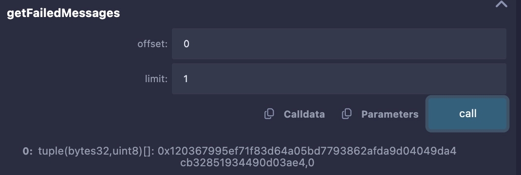 Notice the returned values are: 0x120367995ef71f83d64a05bd7793862afda9d04049da4cb32851934490d03ae4 (the message ID) and 1 (the error code indicating failure).