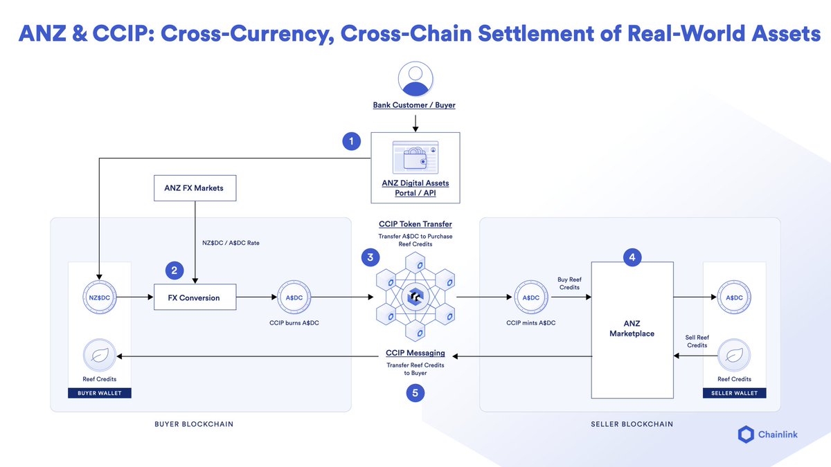 澳大利亚和新西兰银行集团有限公司(ANZ)展示了 CCIP 可编程代币转账如何实现跨境、跨链、跨货币的DvP 交易。在一次单一的跨链交易中,一种由本地货币支持的稳定币(NZ$DC)被转换为另一种不同国家货币的稳定币(A$DC),从买方的源链转移到卖方的目标链,并附带购买代币化资产(例如,珊瑚信用)的指令,随后这些资产被发送回客户在源链上的钱包。