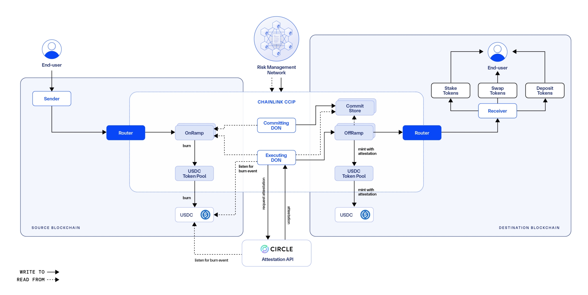 例如,建立在 CCIP 之上的跨链交换应用程序允许用户在 Arbitrum 上持有的 Token A 交换为 Optimism 上的 Token B。操作过程是先将 Arbitrum 上的 Token A 交换为 USDC,然后将 USDC 连同交换数据一起桥接到 Optimism,并自动将 USDC 交换为 Token B,最后发送到用户的钱包。这就是 CCIP 对原生 USDC 支持 的强大之处;它不仅支持通过销毁和铸造方式进行原生 USDC 的跨链转账,而且还支持同时传输有关到达目标链后如何处理 USDC 的数据——这是 CCIP 可编程代币转账的独特功能。