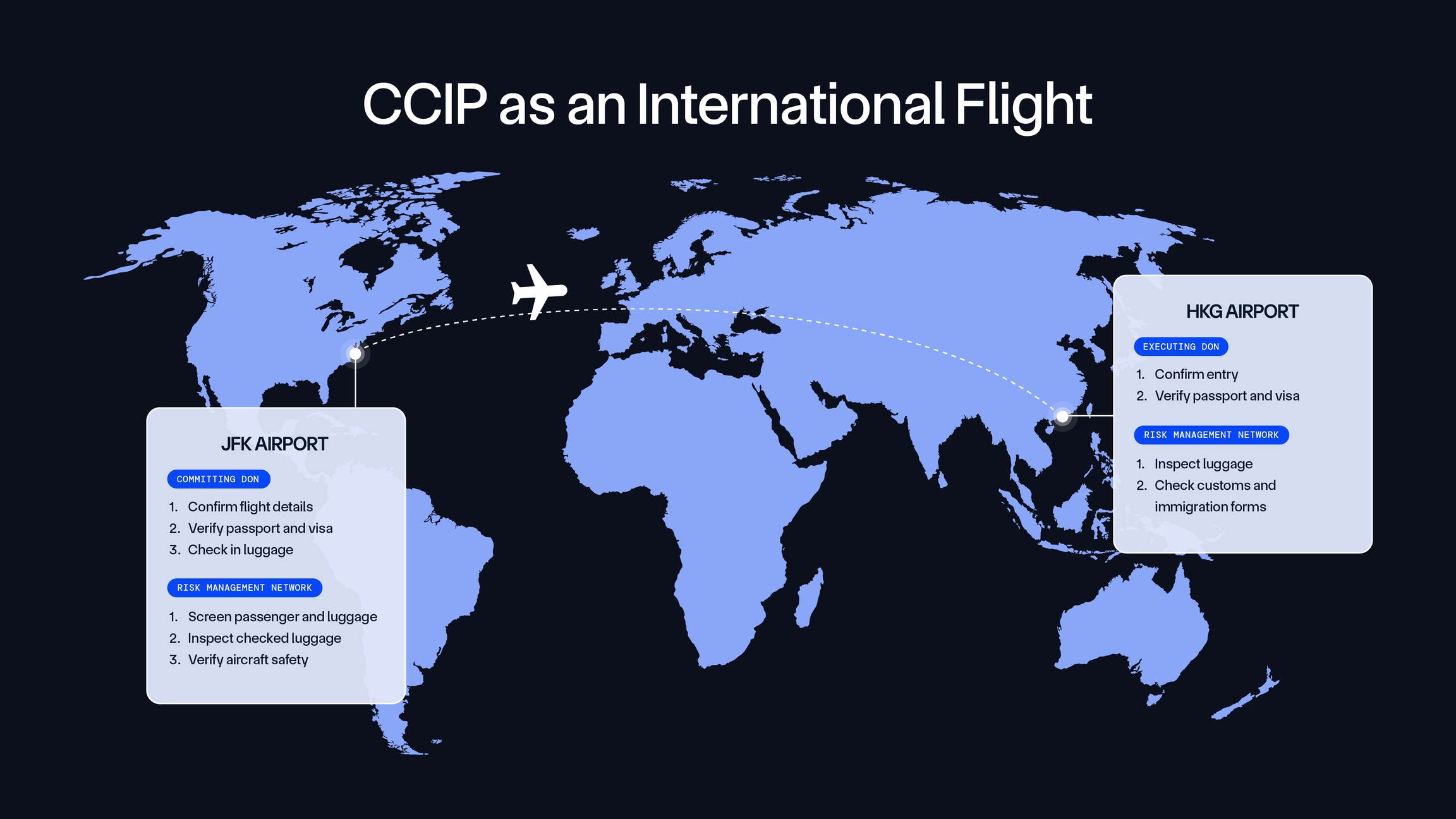 就像国际航班中涉及各种检查站和相应程序确保从一个国家到另一个国家的旅程安全一样,Chainlink CCIP确保了不同区块链网络之间在被验证状态下的安全通信。